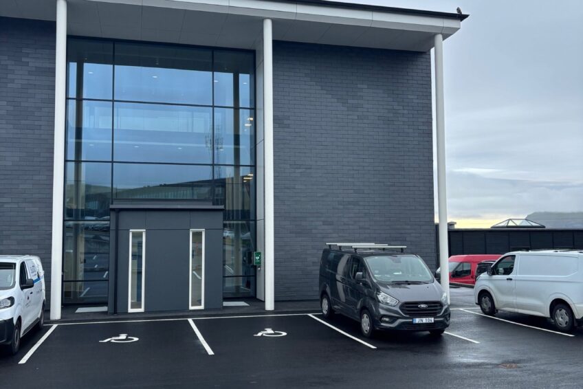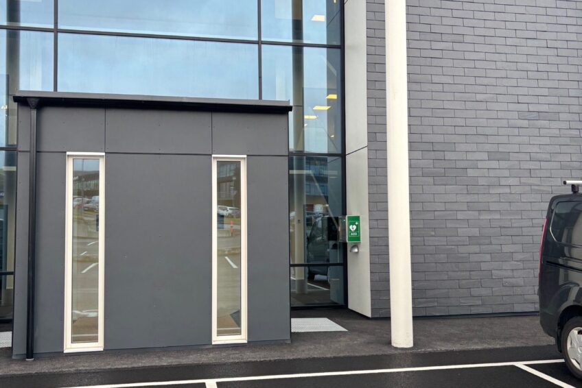Hesin hjartastartarin stendur við høvuðsdyrnar á bygninginum við Óðinshædd 11.